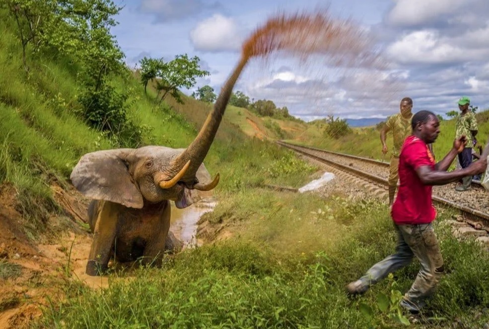 Fotoğrafın hikayesi: Kızgın bir fil, Lopé milli parkında hayvanların kullandığı yollardan geçen bir trenin çarpmasının ardından kendini savunmaya çalışıyor. Park yetkilileri filin kurtarılamayacak kadar ağır yaralı olduğuna karar verip onu öldürdü. Fil öldürüldükten sonra park müdürü hayvanın etini yerel halka dağıttı.