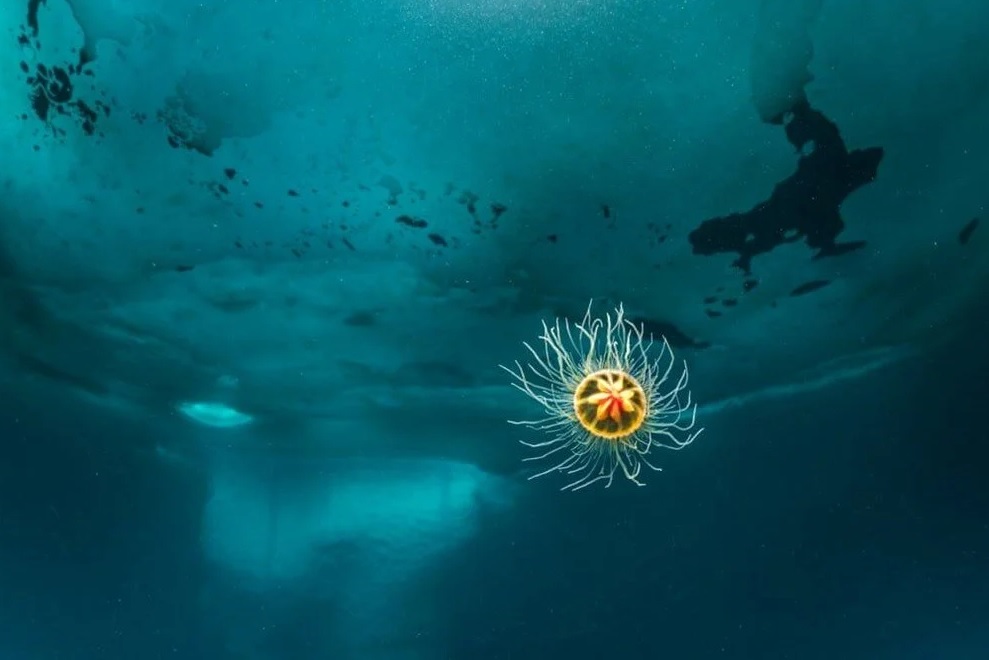 Fotoğrafın hikayesi: Fotoğrafta, bir santimetreden daha küçük bir gövdeye sahip küçük bir bentik hidromedusa görülüyor. Bu az bilinen jelatinimsi organizma derin kutup sularında yaşıyor.