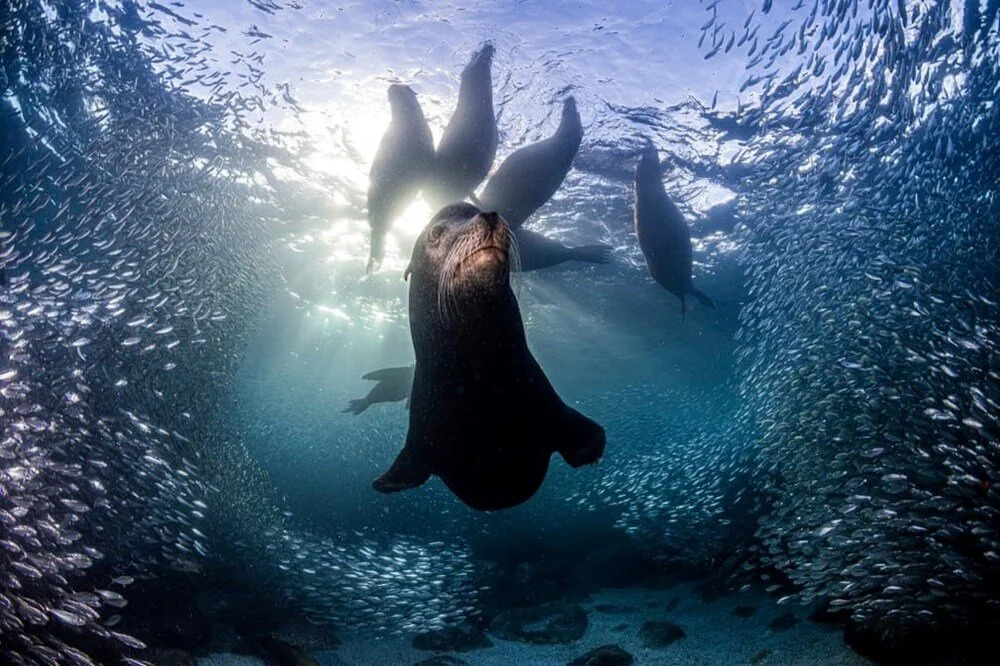 Fotoğrafın hikayesi: California deniz aslanları Meksika'daki Espiritu Santo Ulusal Parkı'nda koruma statüsüne sahip. Bölgenin balıkçılık yapılmayan bir bölge olması, onlara besin açısından zengin bir ortam sağlarken, insan faaliyetlerinin sınırlandırılması da nüfuslarının artışına katkıda bulunuyor.